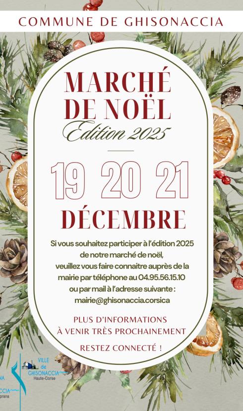 L'édition 2025 du Marché de Noël de Ghisonaccia se tiendra le week-end du 19, 20 et 21 décembre Ven .19 Décembre11h30 ouverture du marché et Bénédi...