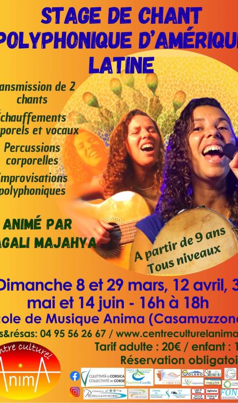Dimanche 8 mars, de 16h à 18h, à l’Ecole de Musique Anima (Casamuzzone) : Stage de chant polyphonique d’Amérique Latine, animé par Magali.